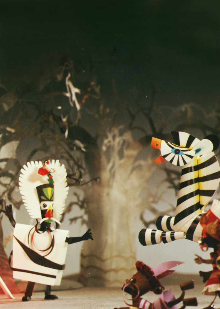 遥远的非洲热带丛林里,四个小姑娘划着荷叶船在河里玩耍,突然,河中升起一座小岛,一匹看不清是黑是白的马在小岛上正跑得欢。小姑娘们看清它是一匹斑马时,斑马忽然卧地不动,出于好奇,她们踏上小岛想看个究竟,不想斑马站起来把她们驮进了黑树林,老巫婆出现了。巫婆手指一指,斑马变成栅栏将小姑娘们围住,随后,巫婆用链锁将她们锁住,去打水准备煮吃她们。为防止她们逃跑,巫婆手里拿着链锁的另一头,不过还是给机智的小姑娘们逃脱了。四个小姑娘来到河边,发现荷叶船已经漂走,而老巫婆追得正紧,求助鳄鱼帮她们过河时,鳄鱼以吃掉她们中的一个作为条件,小姑娘们低头一合计,有了主意。