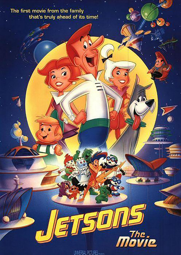 杰森一家已经在一部关于家庭、朋友和其他一切的电影中首次亮相。乔治的“吝啬鬼”老板,斯派西里先生,决心把他在几英里外的矿石小行星上的遥控装置做成100万个链轮,但所有被派去运行它的副总统都因故失踪了,所以斯派西里先生必须找其他人来运行它:它必须是一个强大的勇敢者和强大的愚蠢者。那么他选谁呢?George Jetson。所以乔治把他的家人都打包了:简,他理智而可爱的妻子;朱迪——他叛逆的十几岁的女儿,她有了一个新男朋友:一个超级银河摇滚明星;艾尔罗伊——对他父亲失去信心的篮球冠军;还有罗西,他的野蛮女仆。所以,当朱迪遇到另一个男孩,享受一个巨大的购物中心时,乔治开始和他的新朋友,一个叫鲁迪2的机器人工头一起工作。工厂很快在开业当天遭到破坏,所以乔治打算调查并消失。所以由艾尔罗伊和他的新朋友来拯救乔治。